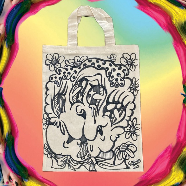直筆ドローイングトートバッグです。 バッグはA4サイズの物がピッタリ入るサイズ感です。 トートバッグでのご使用の他にフレームに入れて飾って頂くのもオススメです☆ ※ドローイング部分は油性マジックで描画していますので、濡れたままでの放置や洗濯は推奨しておりませんのでご注意ください。